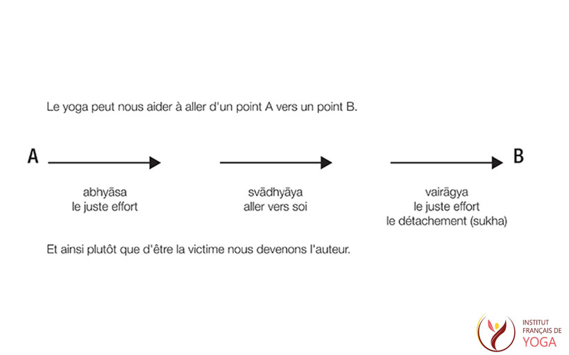 Le sūtra I. 12 abhyāsa-vairāgyā-bhyāṃ tan-nirodhāḥ nous conseille de prendre davantage de recul (vairāgyā) et de rester en relation (abhyāsa) malgré les difficultés. Ainsi peu à peu vient l’apaisement. Face aux changements permanents de la vie, mieux vaut aller doucement, tranquillement, avec confiance mais aussi avec persévérance.