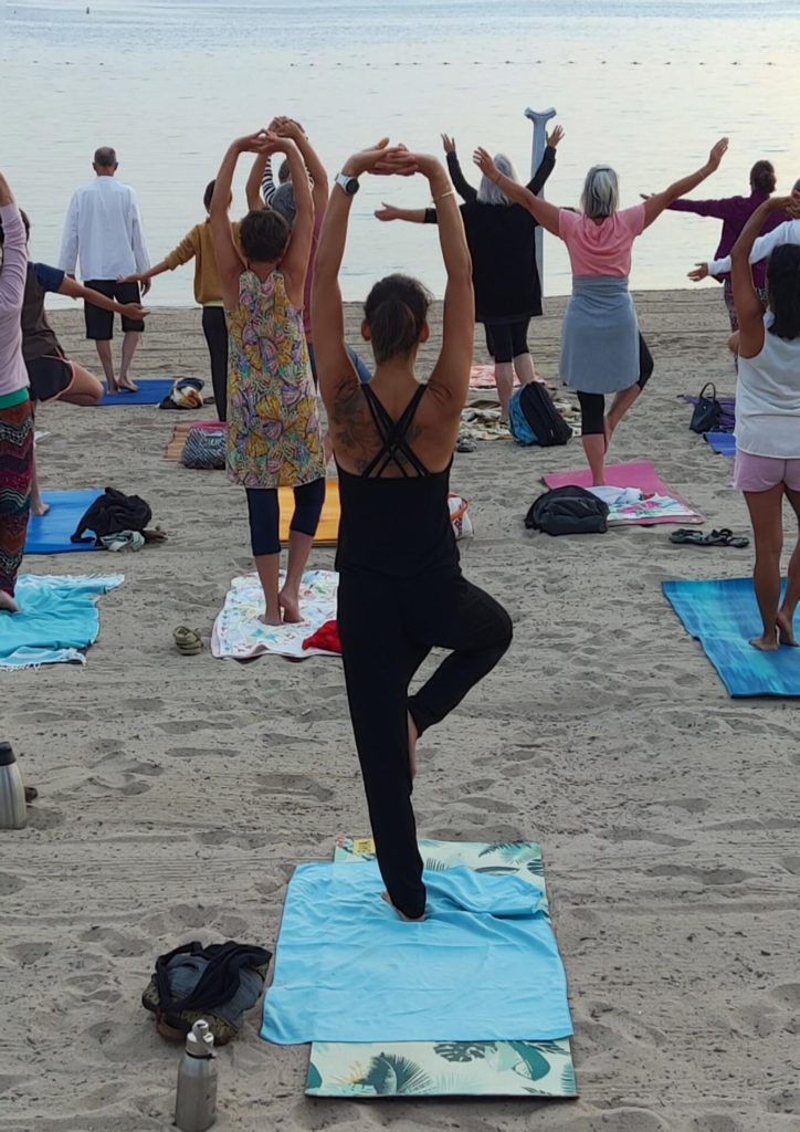 Quelques photos de la séance au lever du soleil, sur la Plage du Ponteil (Antibes) : nous étions 120 sur les tapis, guidés par Nathalie Moulis, entourée de professeurs IFY PACA, pour cette pratique qui nous a reliés à la Source.