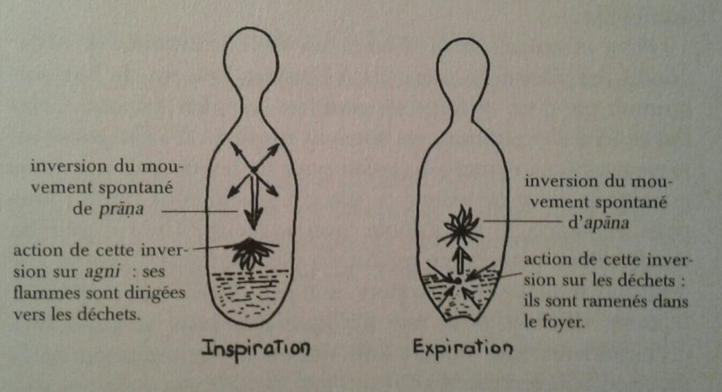 Rappelons que pour le yoga, le souffle est la vie elle-même. A notre naissance, nous recevons une quantité de souffle vital et notre rythme respiratoire a pour but de le faire circuler dans le corps. Le contrôle du souffle va inverser les flux : l’air inspiré devient un véhicule pour prâna qui descend le feu (agni) vers l’abdomen. L’arrêt plein maintient la flamme vers le bas afin de consumer les déchets (mala) et à l’expiration, apâna remonte vers le feu et l’arrêt vide maintient la flamme vers le haut.